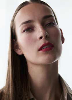 Selbstbewusste Modernität in ausdrucksvollem Rot! Matt und präzise setzt der Sensual Lipstick Scarlet den Mund in den Fokus. Ein Ausdruck purer Präsenz, den der Automatic Pencil for Eyes Cranberry in einer klaren Linie am Lidrand entlang fortsetzt. Der sehr natürlich gehaltene Teint unterstreicht den kraftvollen Minimalismus des Looks.