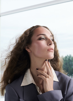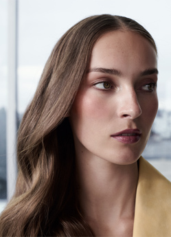 Vom harmonischen Spiel warmer und kühler Akzente geht eine starke Anziehungskraft aus. Das Puder-Rouge Tender Blush Golden Amber erwärmt Wangen, Augenlider und Schläfen, während der Pencil for Eyes in kühlem Walnut Silk dem Blick selbstsichere Tiefgründigkeit verleiht. Der Mund in tiefviolettem Purple Gem erhält durch den Lip Shine Glanz und lebendigen Ausdruck.